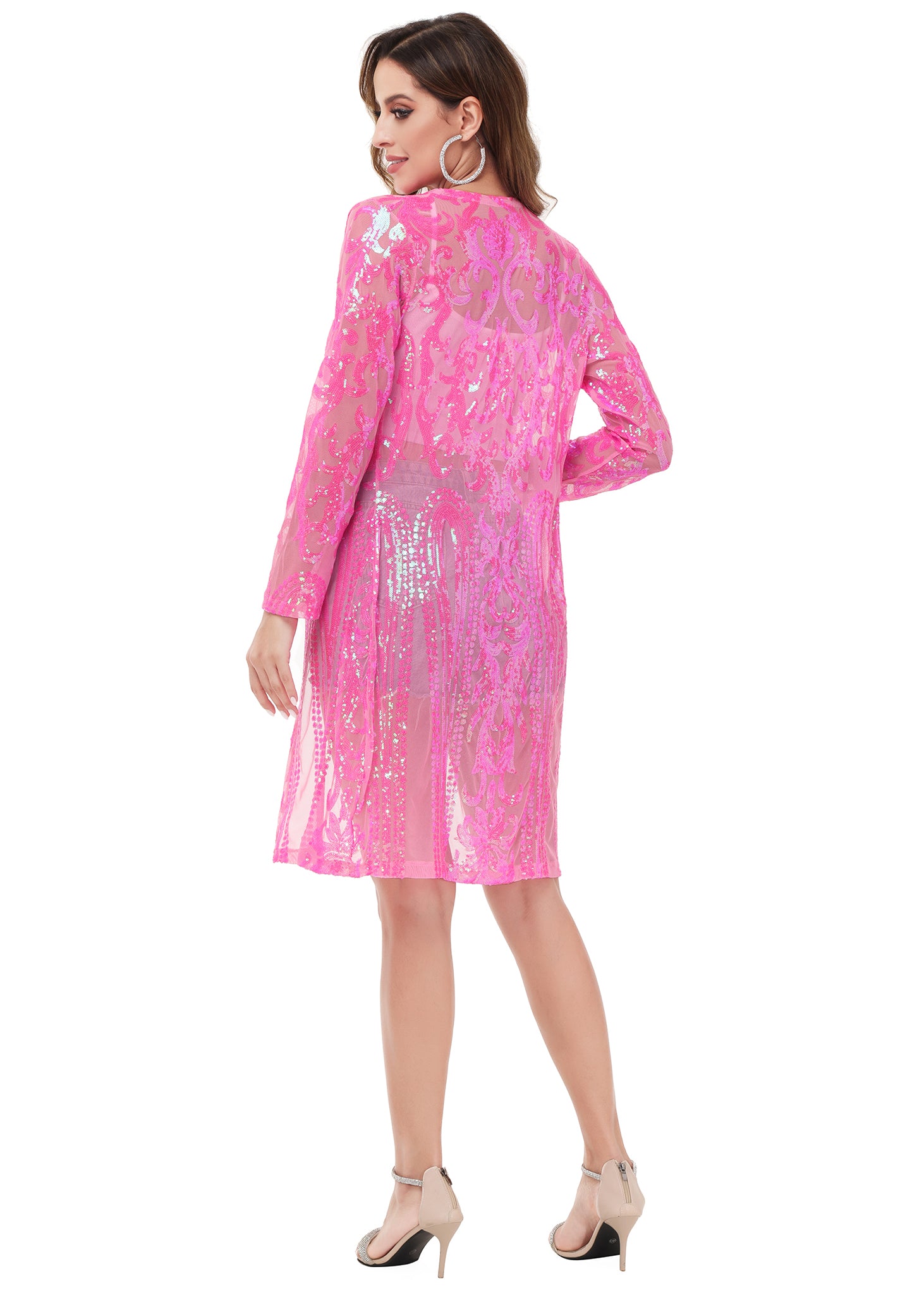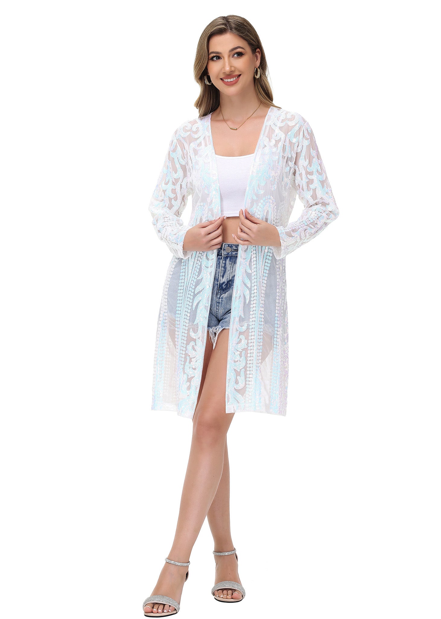 FEATURES. The womens holiday cardigans features sparkly sequins, See Through, long sleeve, open front, keen length, and buttonless design, summer beach cover ups.
