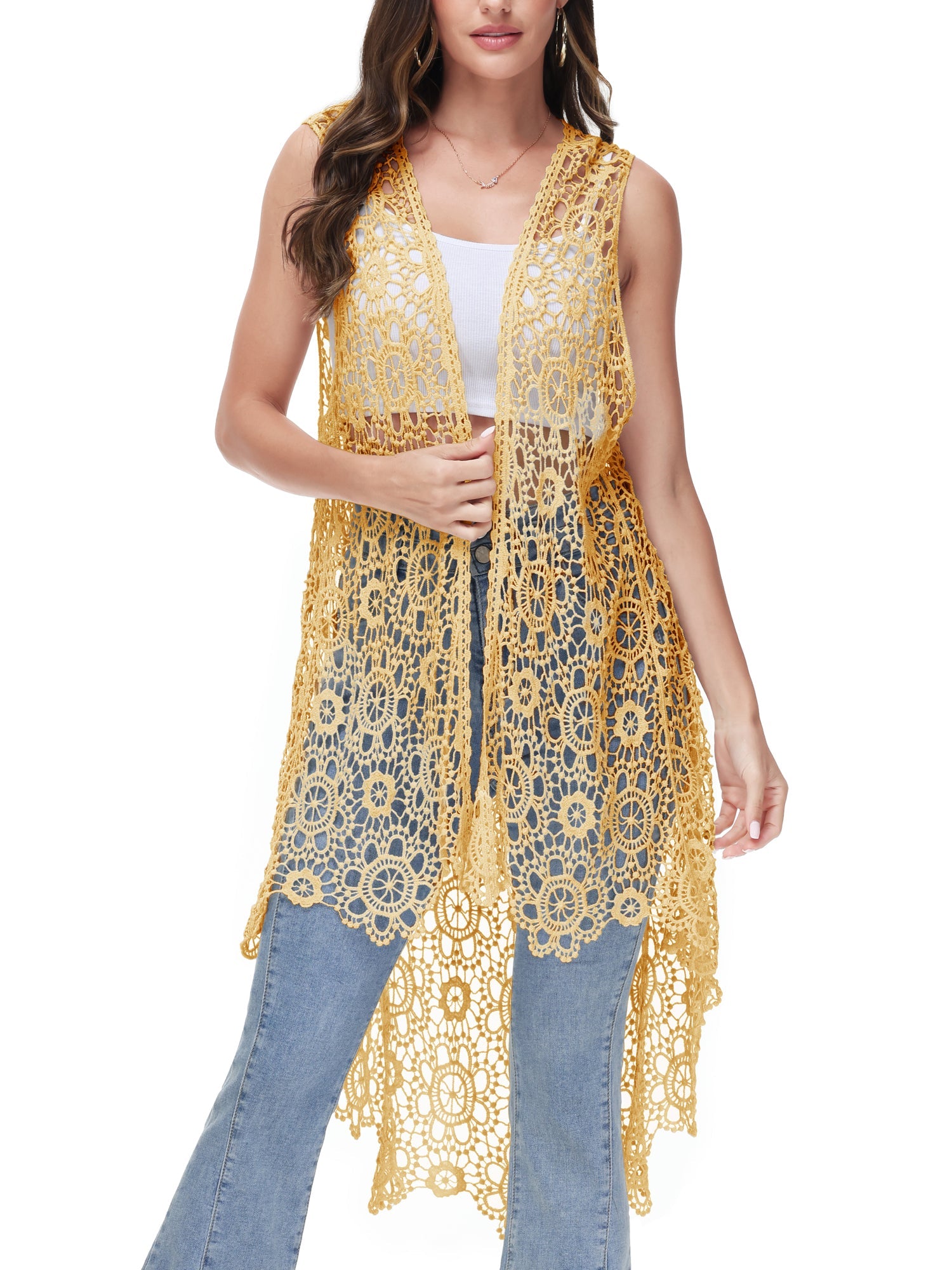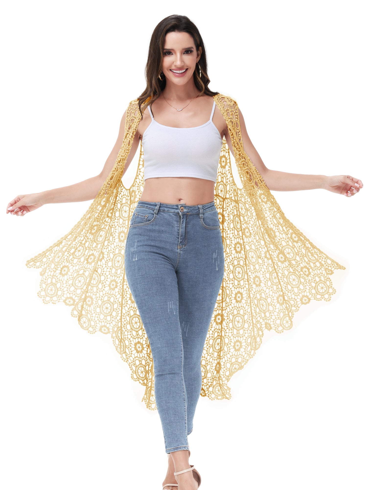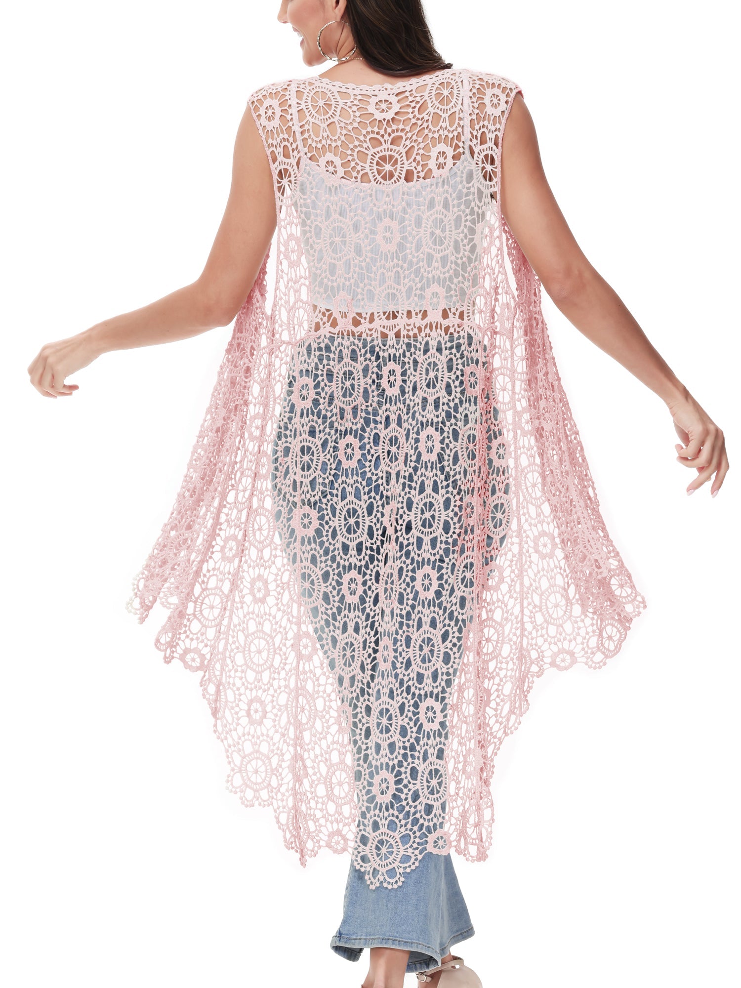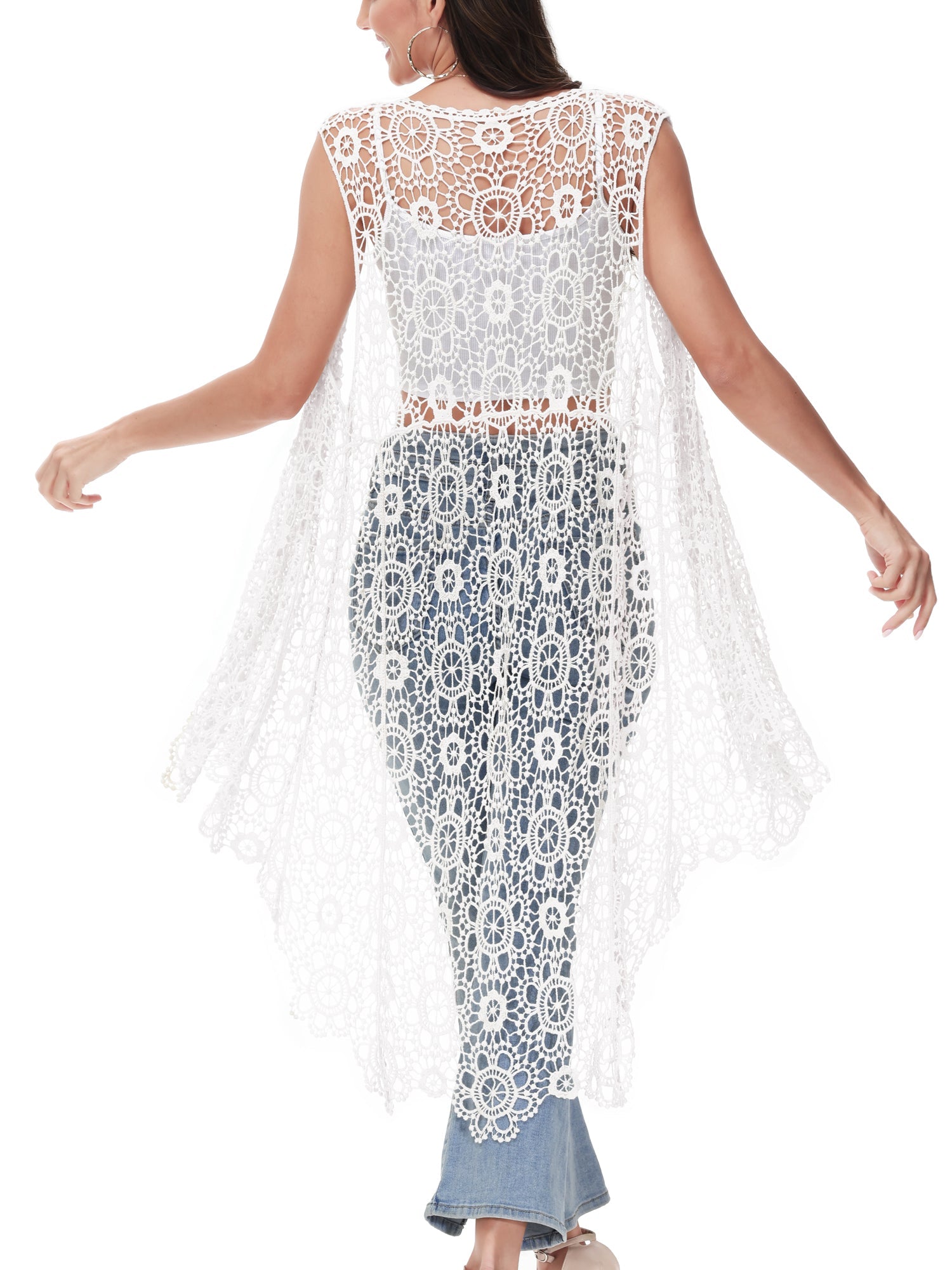Anna-Kaci Boho Crochet Long Vest Top for Women Sleeveless Lace Cardigan Kimono Swimwear Cover Ups