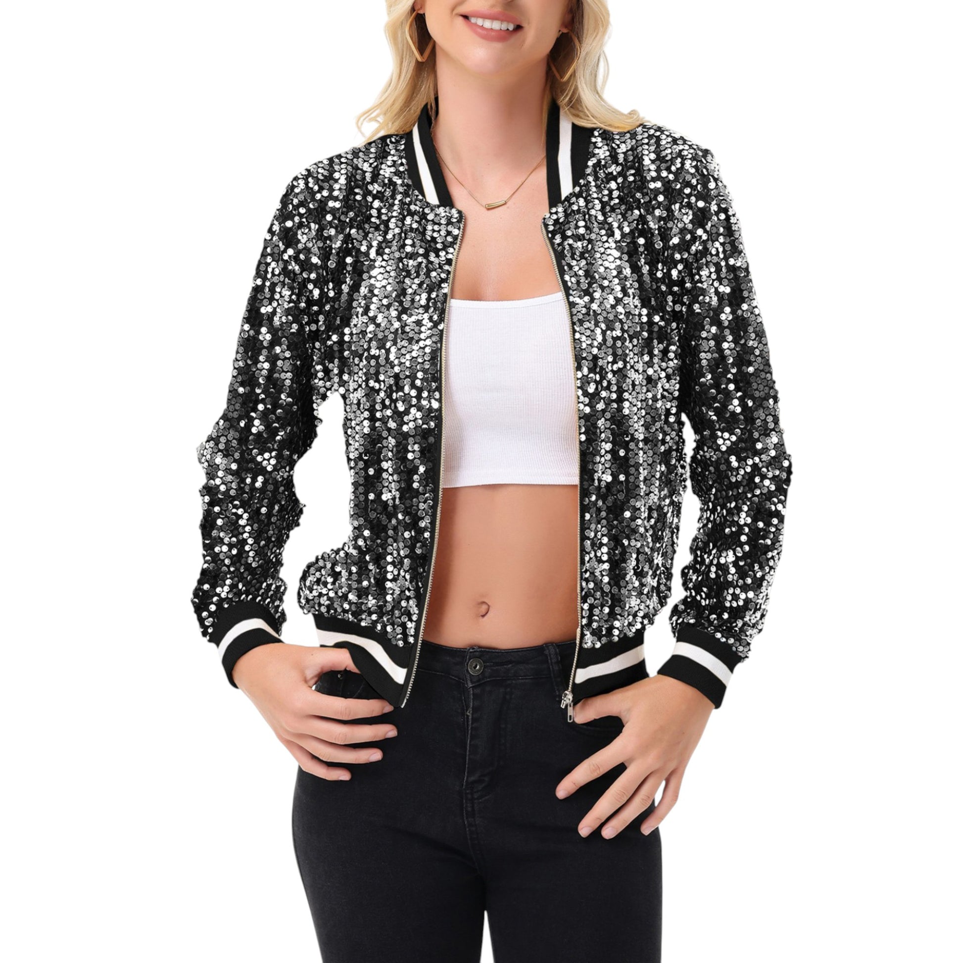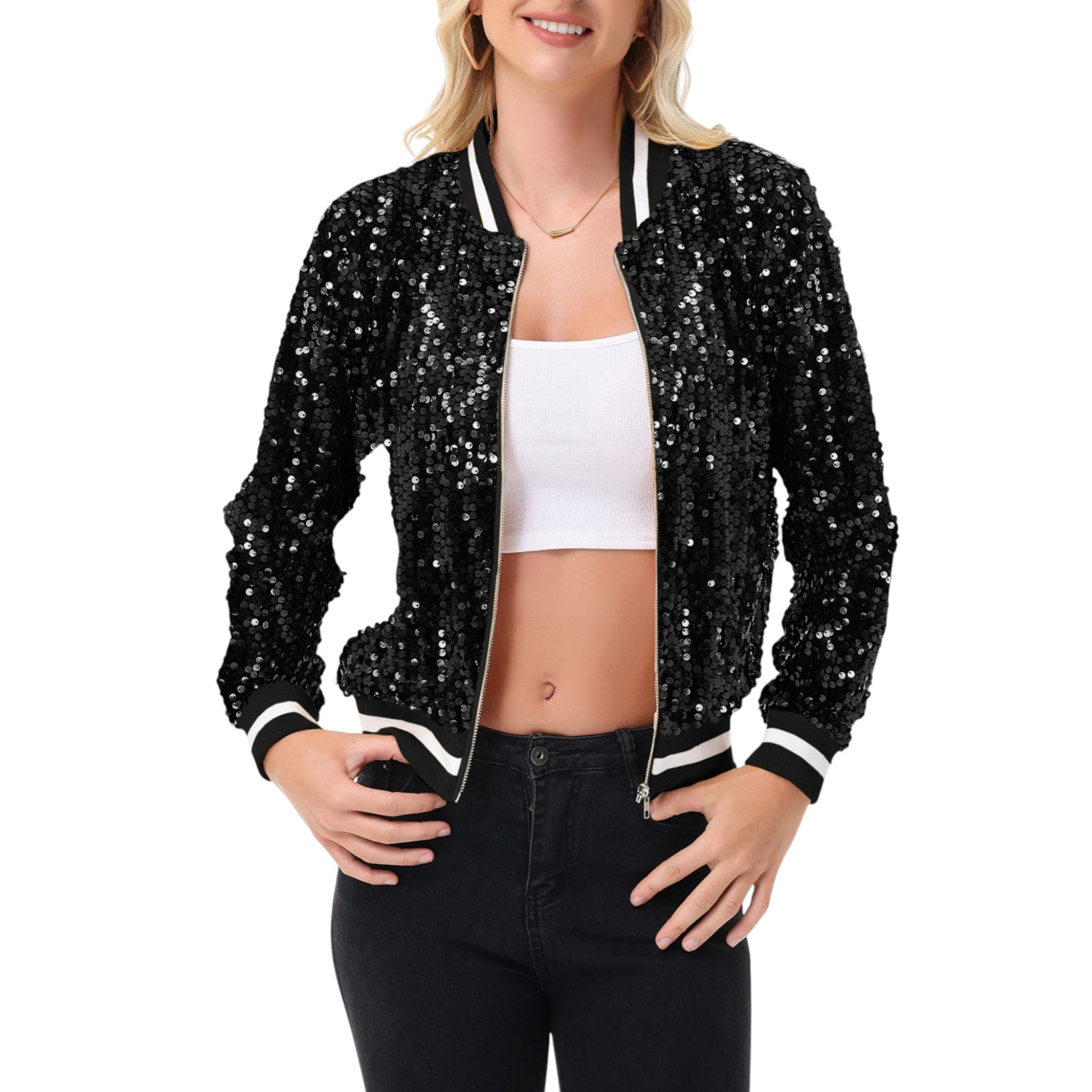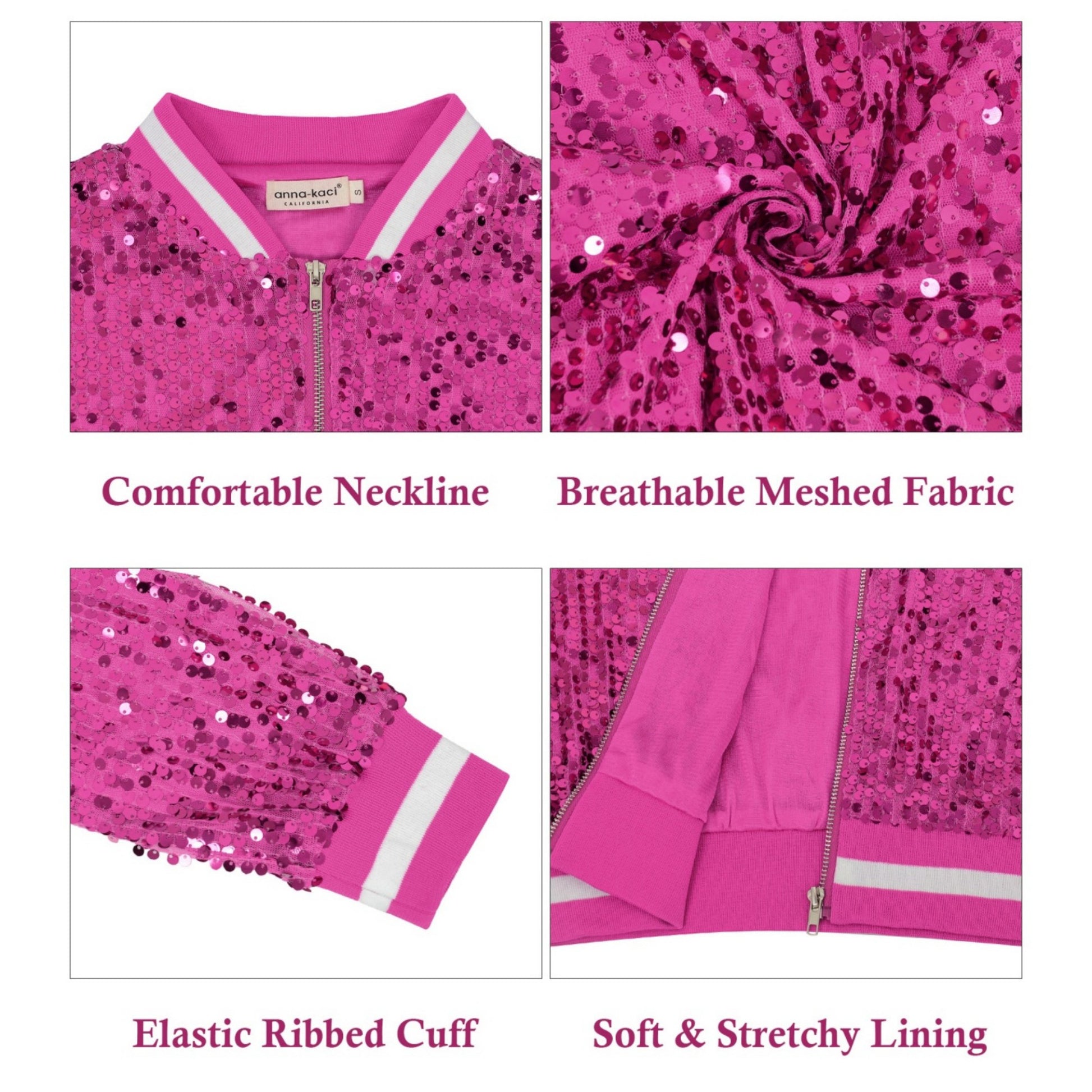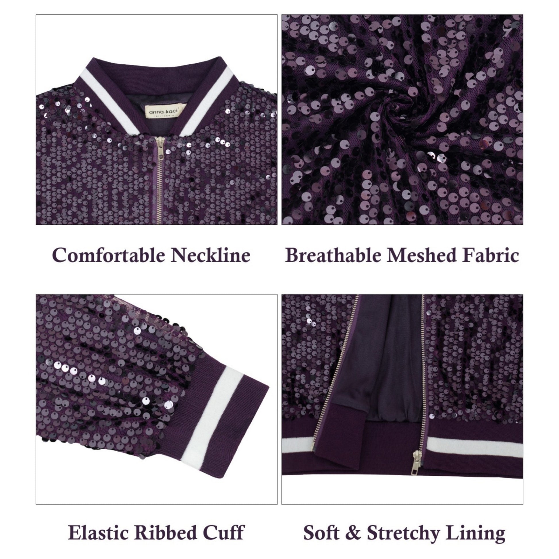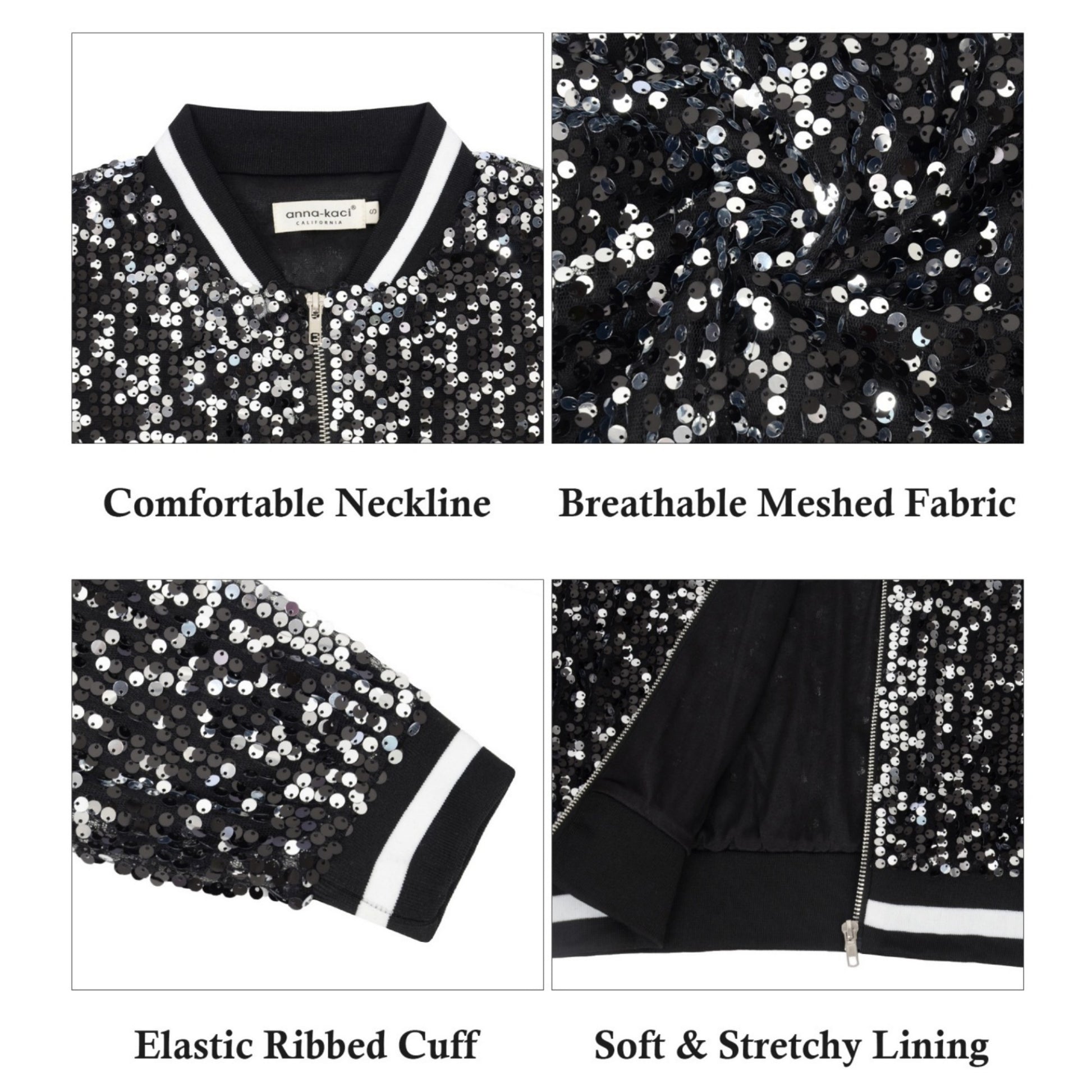 Anna-Kaci Women's Sequin Bomber Jacket with Ribbed Trim and Front Zipper Closure