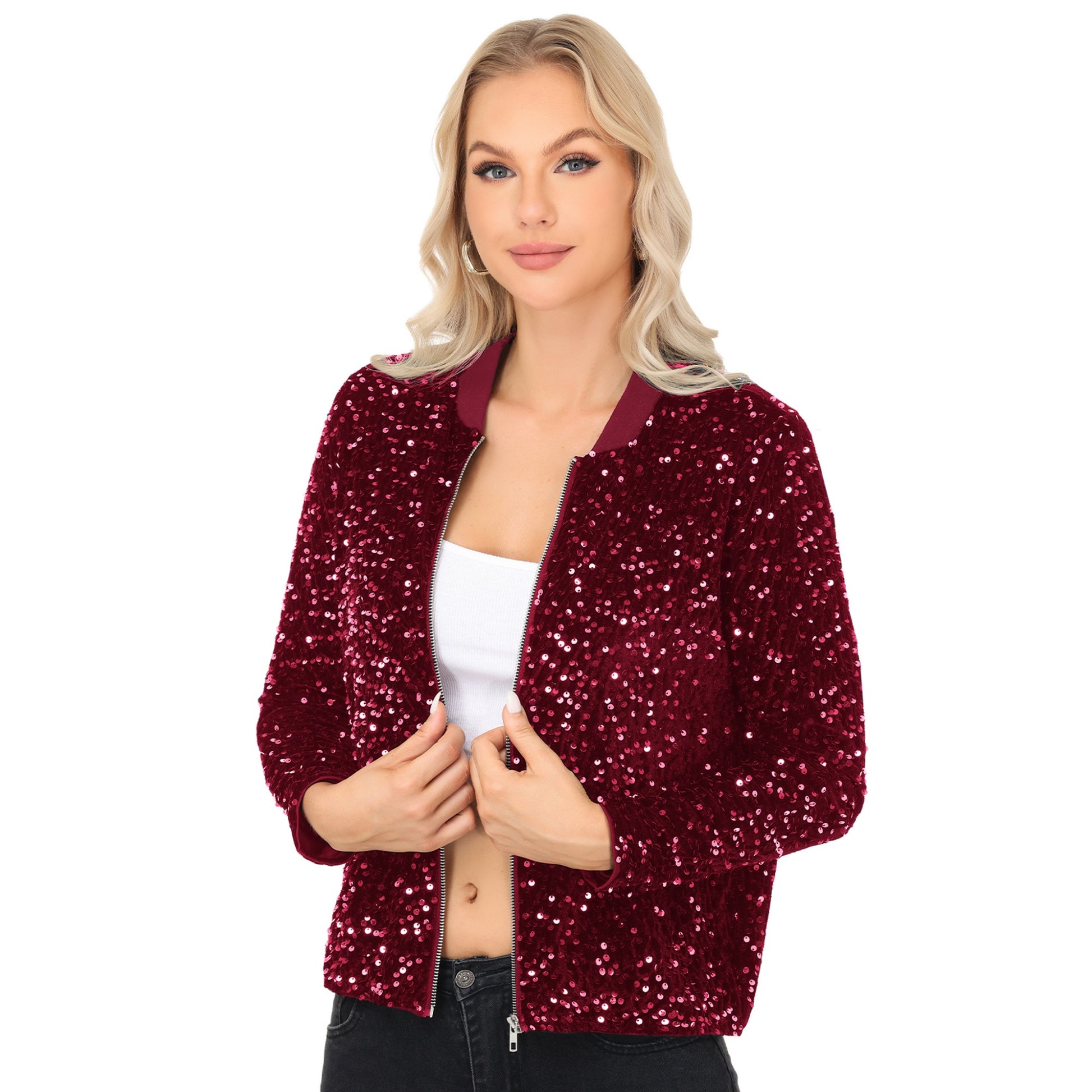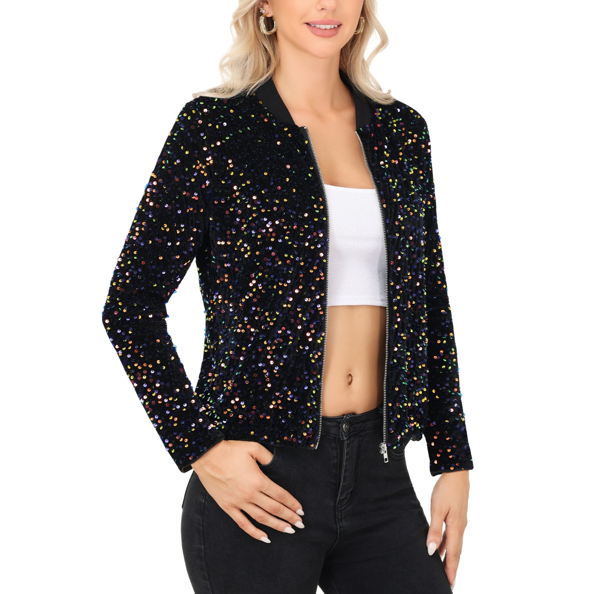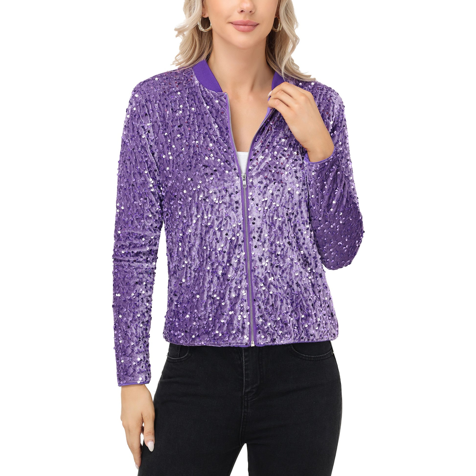 Anna-Kaci Women's Sequin Bomber Jacket with Front Zipper Closure and Ribbed Trim
