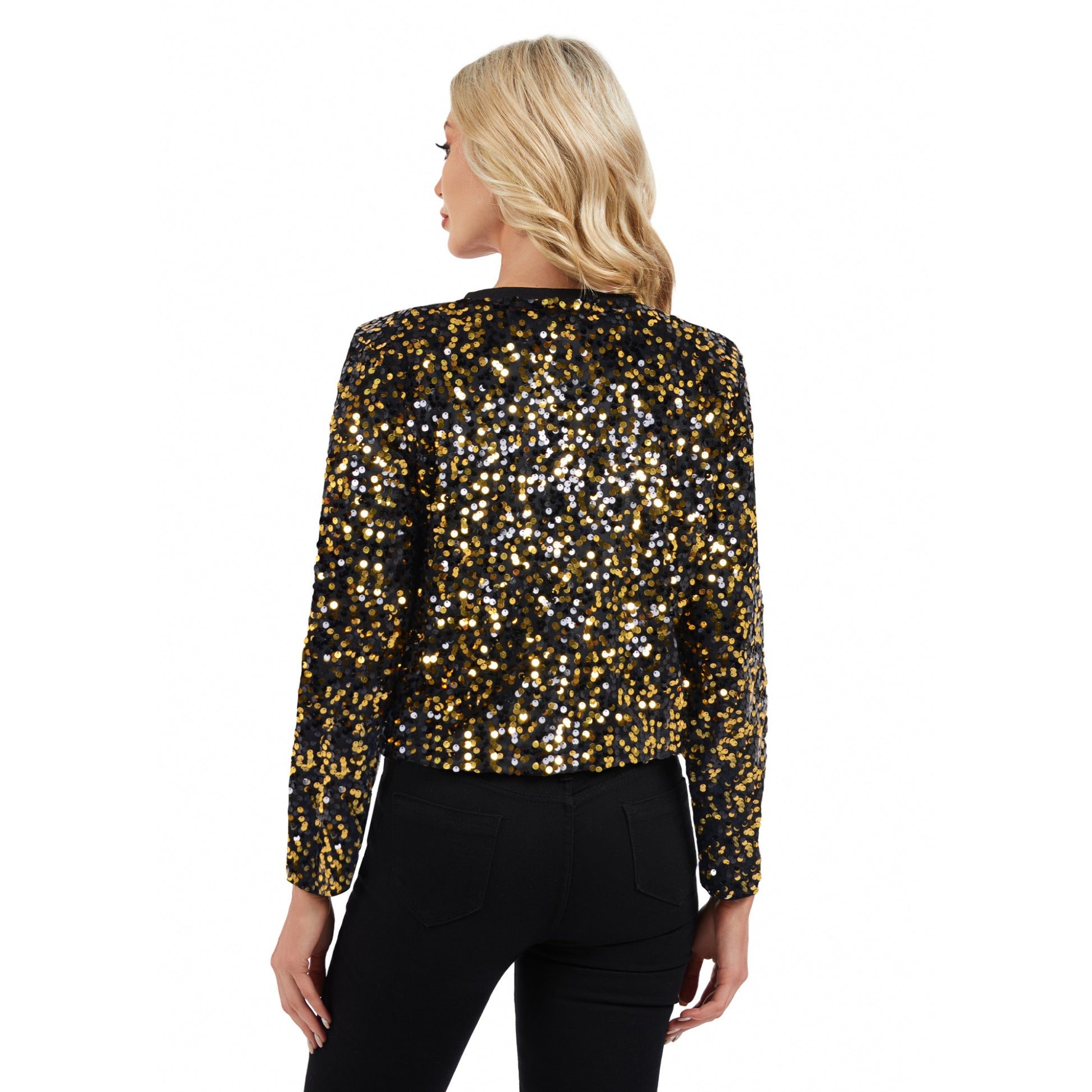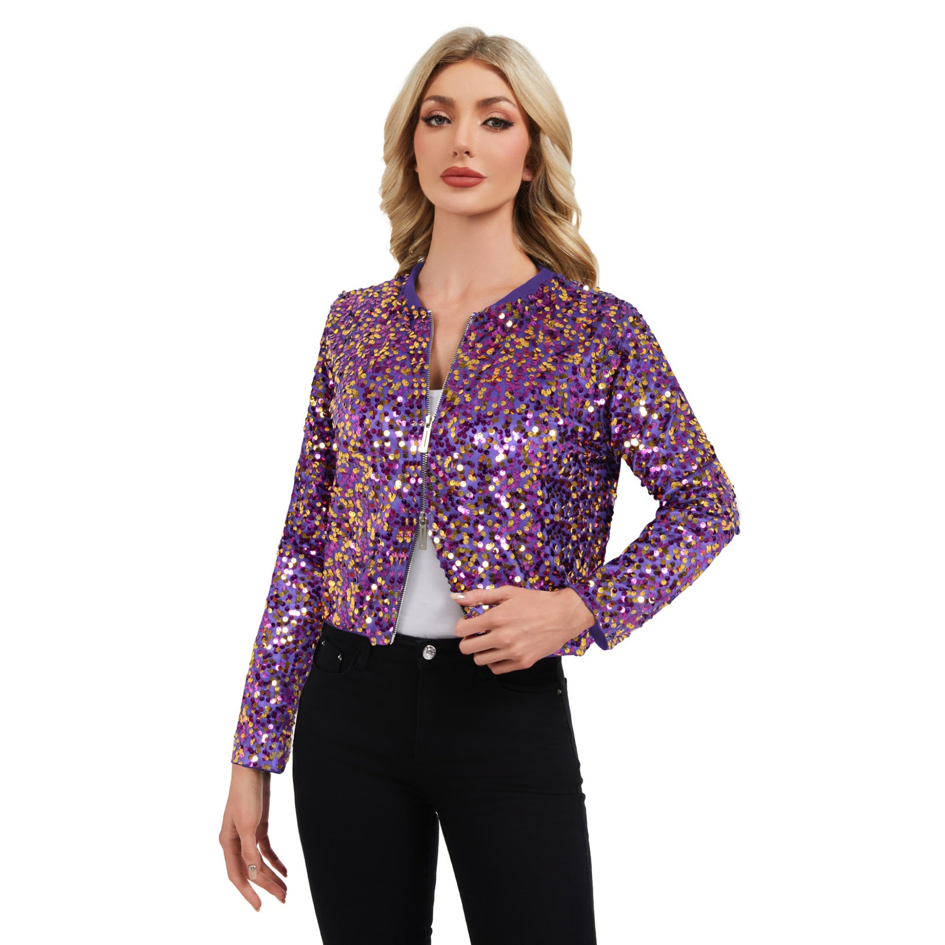 The Anna-Kaci Women's Sequin Bomber Jacket with Zipper Front and Ribbed Trim adds bold sparkle to any outfit. Covered in vibrant multicolor sequins, this jacket delivers eye-catching shimmer and a playful twist on a classic silhouette. The front zipper closure offers versatile styling, while the ribbed collar, cuffs, and hem ensure a comfortable and flattering fit. Perfect for adding personality to both casual and evening looks.