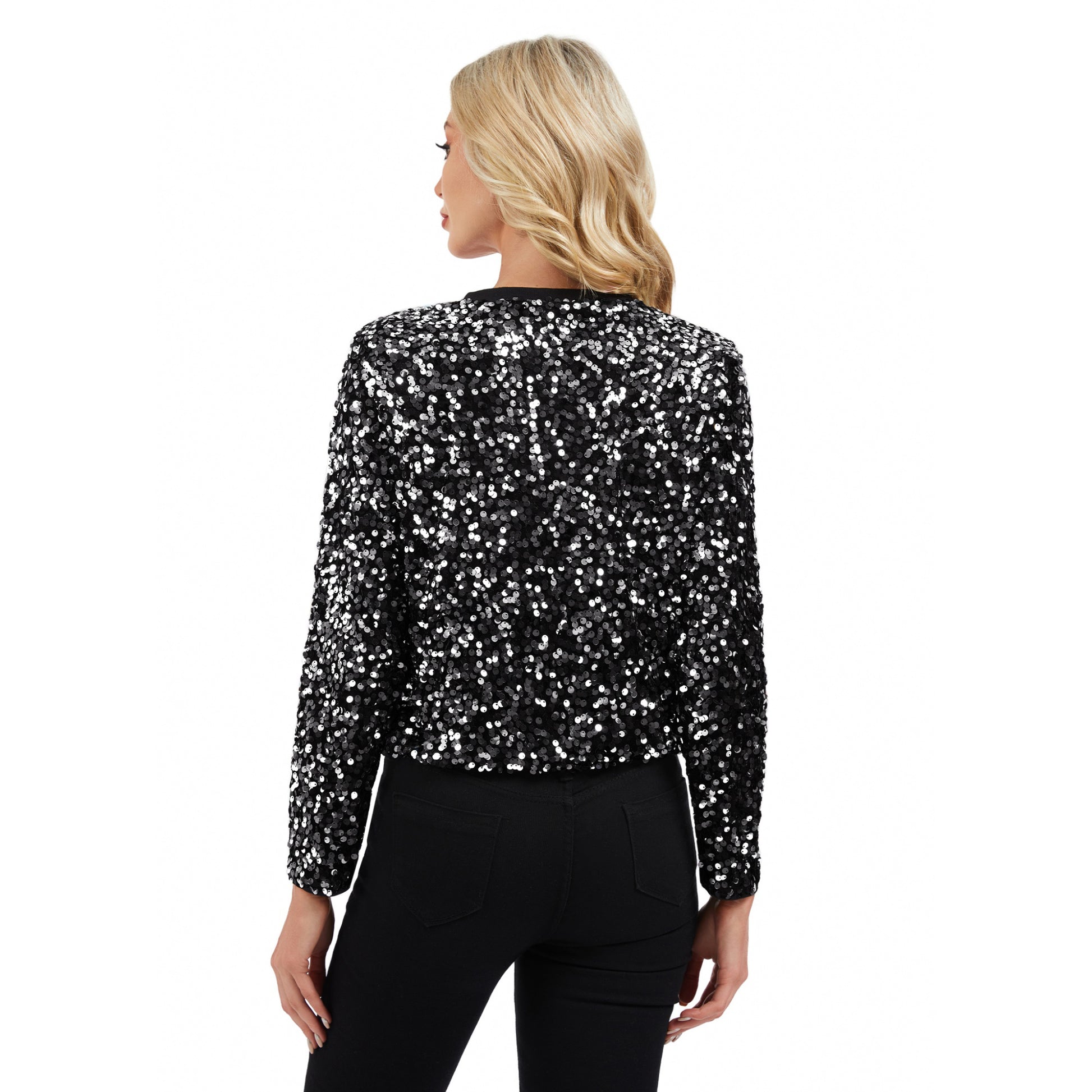 Anna-Kaci Women's Sequin Bomber Jacket with Zipper Front and Ribbed Trim